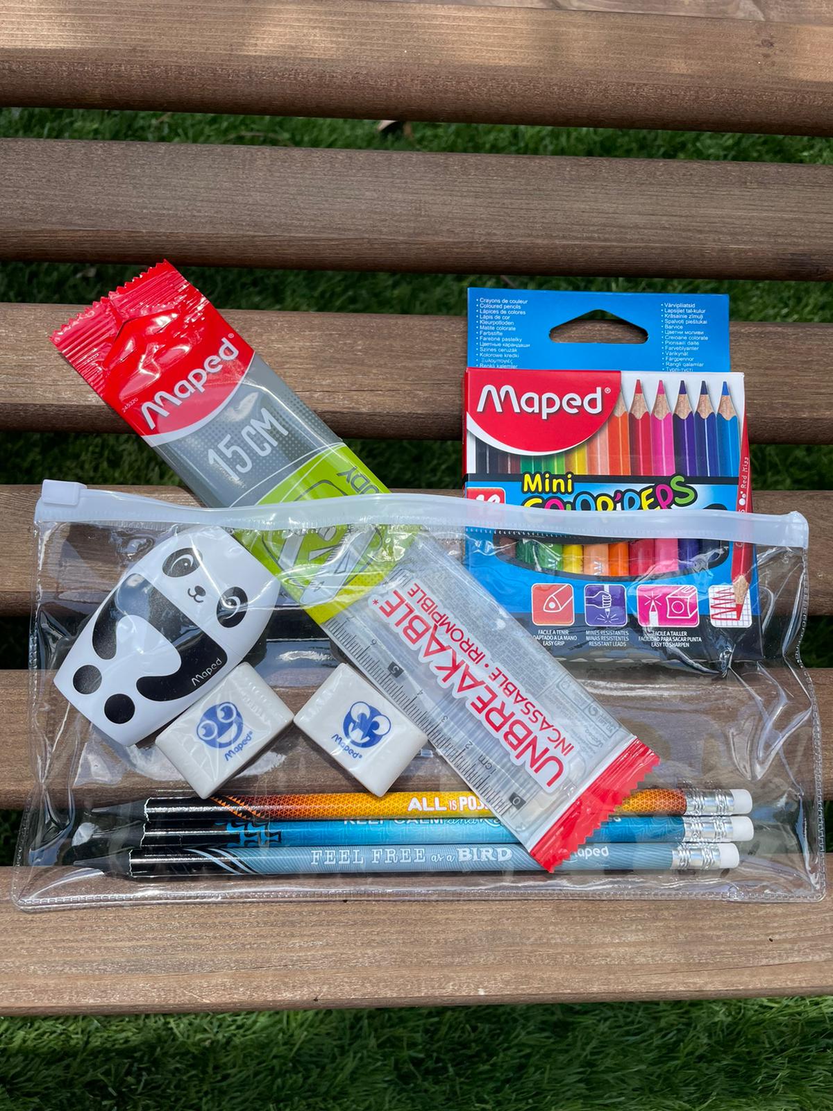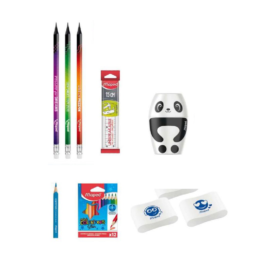 סט מוצרי כתיבה לתחילת הלימודים של חברת Maped האיכותית והוותיקה –שלושה עפרונות, חבילת 12 עפרונות צבעוניים קטנים, סרגל, שני מחקים, ומחדד.