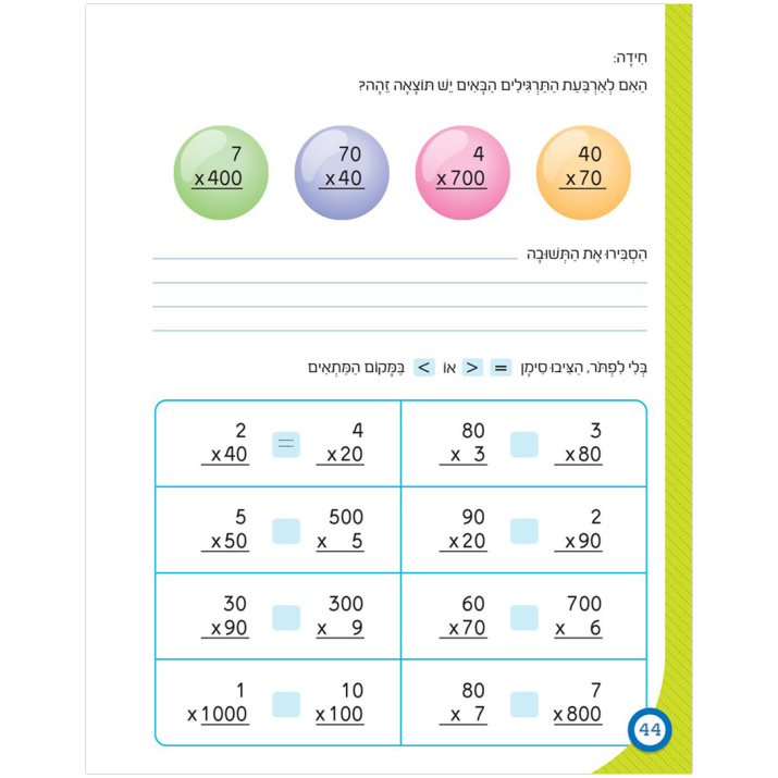 בעזרת המחשות ואיורים צבעוניים, מכירים הילדים את המספרים עד 10,000. נושא הערך העשרוני שב ומודגש בתרגילי כפל בעשרות ובמאות, בהם מקום הספרה משתנה לאורך התרגיל. בין הנושאים השונים משובצים גם משחקים, חידות וכתבי קוד, כרגיל!