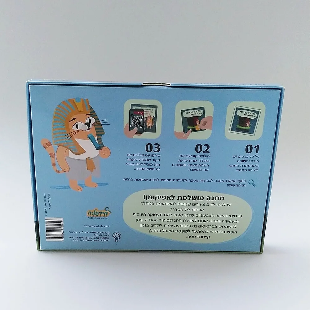 בצד האחורי של הכרטיס יש איחול לחג וקוד לסריקה. במהלך חופשת החג תוכלו לסרוק עם הילדים את הקוד בגב הכרטיס ולהינות מקריאה משותפת של העמוד הייעודי באתר: שם ניתן למצוא מידע נוסף ומנוקד בנושא החידה, וסרטונים רלוונטיים.