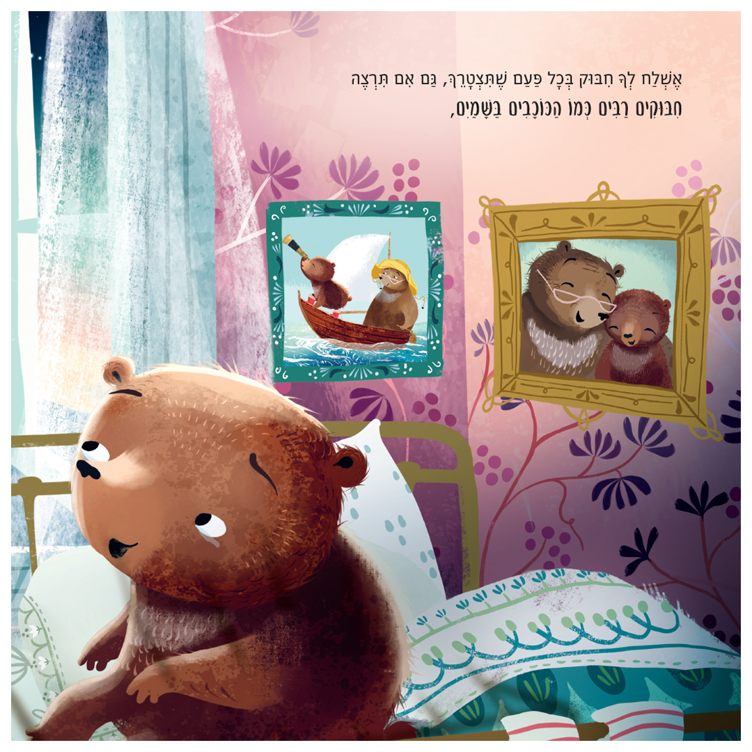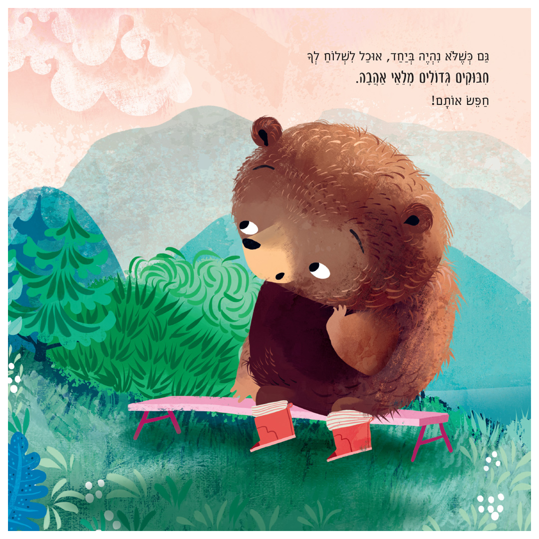 כך יוצא הדובון למסע של גילוי, ולומד שחיבוק יכול להופיע בכל צורה, צבע ורגע של דמיון.