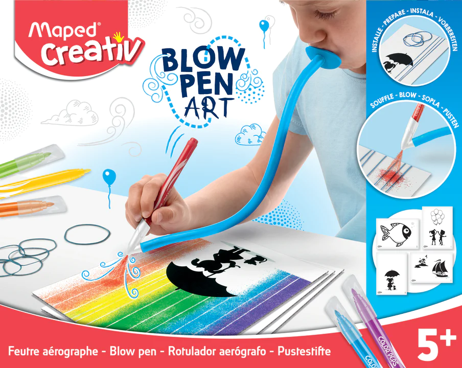 ערכת טושי נשיפה – חבילה של שישה טושים, צינור נשיפה (עם שסתום חד כיווני), שבלונות ודפי צביעה.