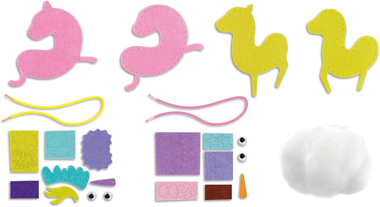 יריעות לבד חתוכות מראש, מדבקות לבד, עיני פלסטיק, חומר מילוי וחוטים צבעוניים. החוט עבה והחורים גדולים כדי להקל על תהליך התפירה לידיים קטנטנות.