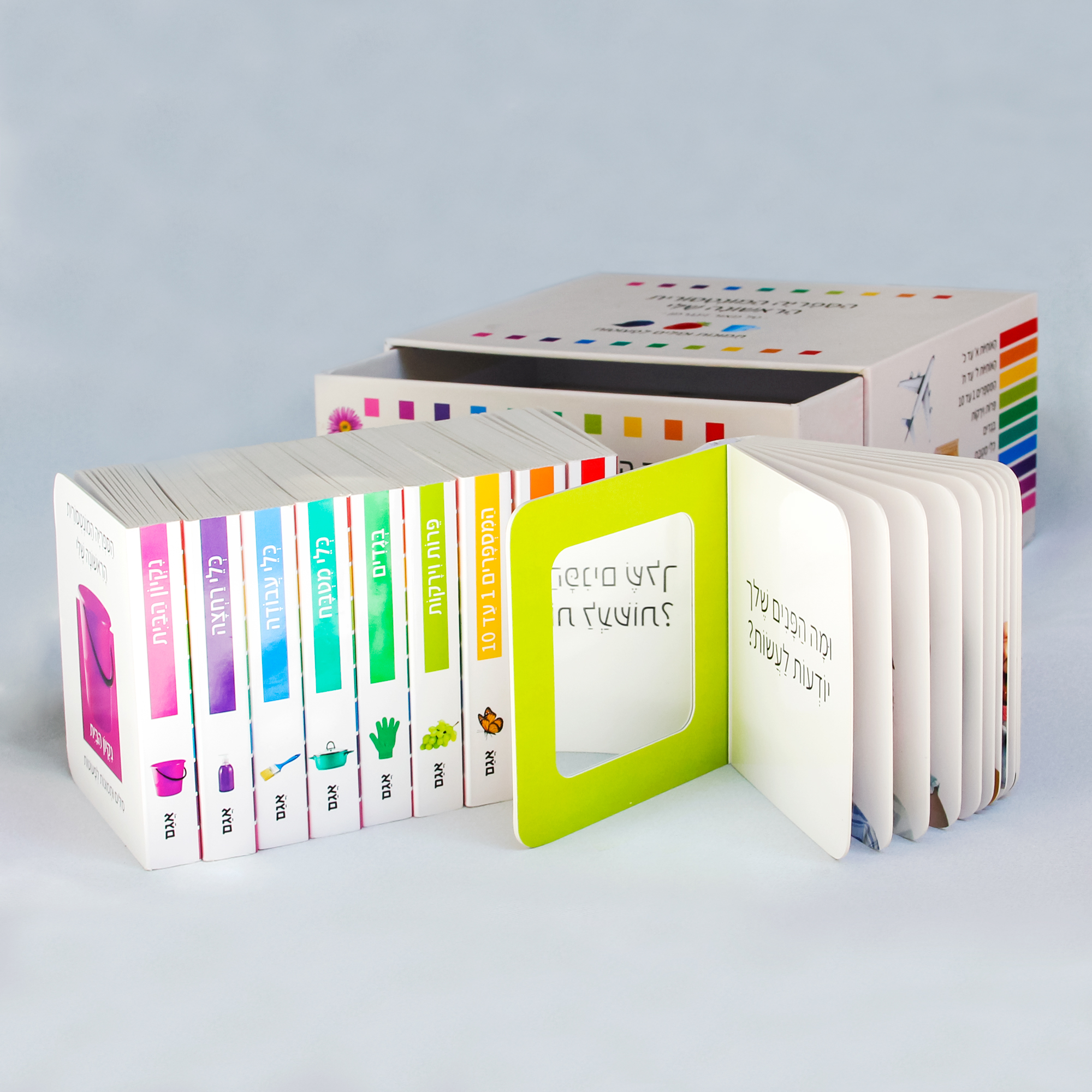 שישה מהספרונים עוסקים בפרטים מחיי היומיום של הילד – ירקות ופירות, בגדים, כלי מטבח, כלי עבודה, כלי רחצה וניקיון הבית, ושלושה ספרונים עוסקים בהכנה לשלבים הבאים של התפתחות השפה (שניים באותיות הא׳-ב׳ – ואחד במספרים 1 עד 10), ובהם תמצאו אותיות וספרות שקועות בתוך הדף, כאשר ניתן להעביר בתוכן את האצבע ולהכיר את צורת האות בדרך של מישוש.